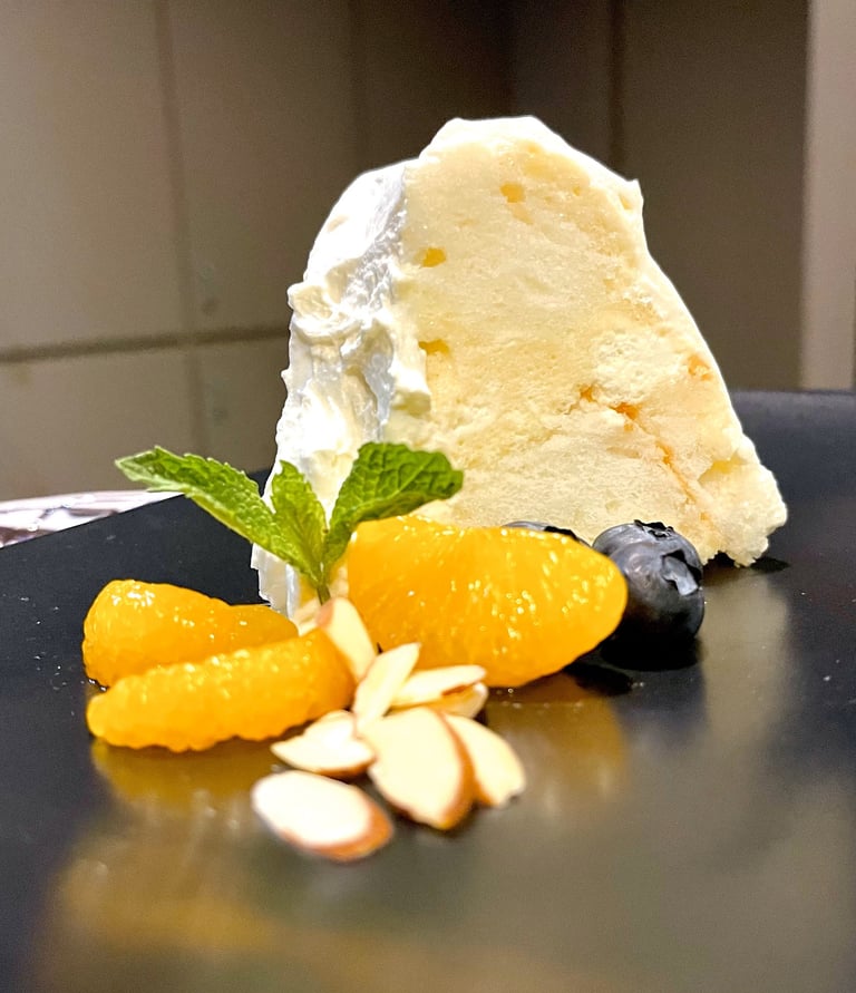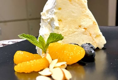 A light airy cake topped with velvety cream with fresh citrus and toasted almonds
