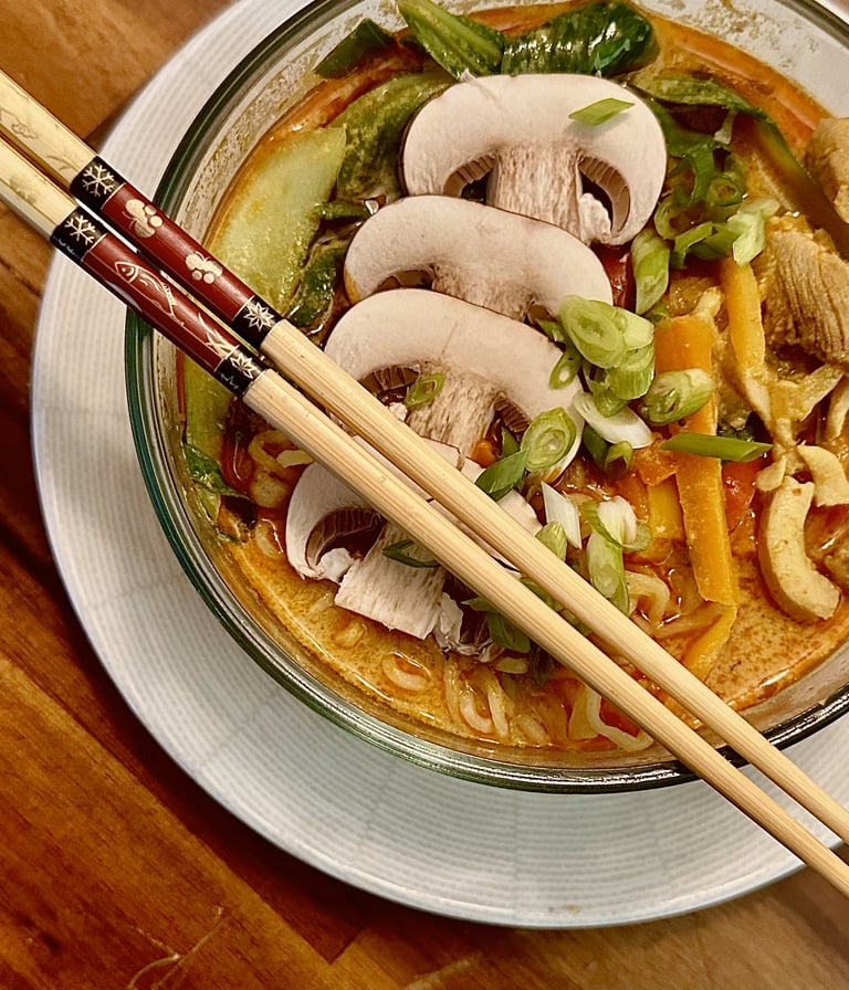 Delicate, rich broth with shiitake and hand-sliced vegetables. Vegan-friendly.